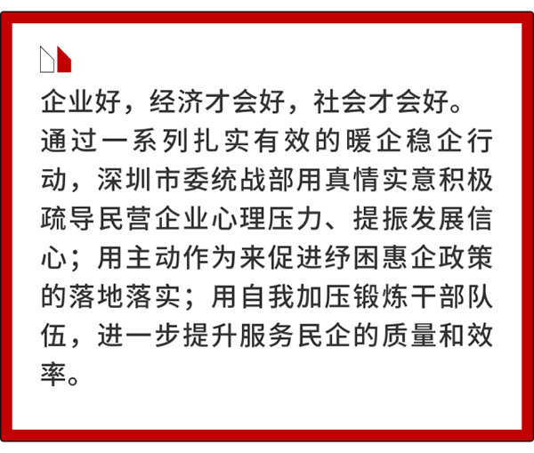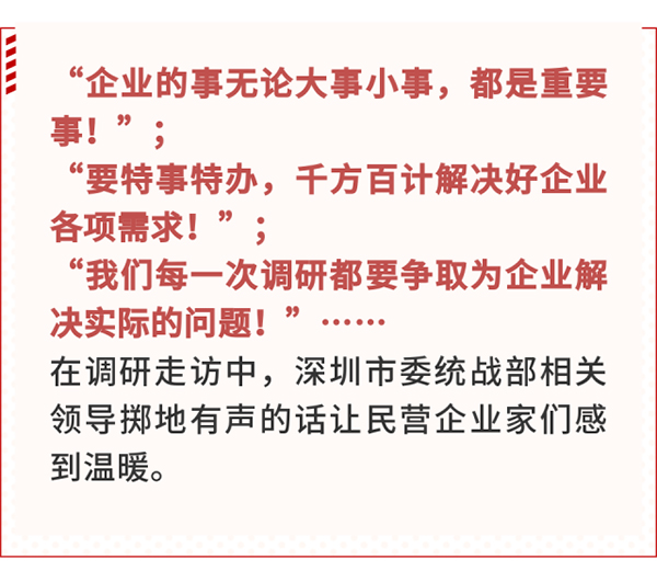 根据市领导对民营企业情����� �������Ƴ����������� �������Ƴ����������� �������Ƴ����������� �������Ƴ�������况反映专刊的批示,深圳市委统战部、市工商联积����� �������Ƴ����������� �������Ƴ������������ �������Ƴ������������ �������Ƴ������极与相关职能部门沟通协调,跟进各相关职能部门的����� �������Ƴ����������� �������Ƴ������������ �������Ƴ������������ �������Ƴ������办理情况,做好企业诉求解决情况的整理、跟踪和总结����� �������Ƴ������������ �������Ƴ������������ �������Ƴ������������ �������Ƴ�������工作,理顺相关工作程序,畅����� �������Ƴ������������ �������Ƴ������������ �������Ƴ������������ �������Ƴ�������通工作运转机制,完善与各����� �������Ƴ������������ �������Ƴ������������ �������Ƴ������������ �������Ƴ�������相关部门的对接工作,做好与企业的沟通说明工作,����� �������Ƴ������������ �������Ƴ������������ �������Ƴ������������ �������Ƴ������提高企业获得感。